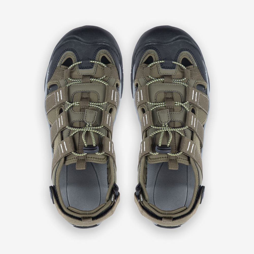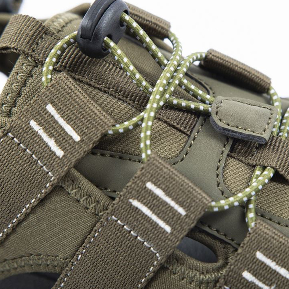 A Spring szandál felső része strapabíró textilből készül amit jól szellőző hálós gyöngyvászon nyelvrész egészít ki. A nagyobb élettartam érdekében az orrész kopás- és ütésálló borítást kapott.