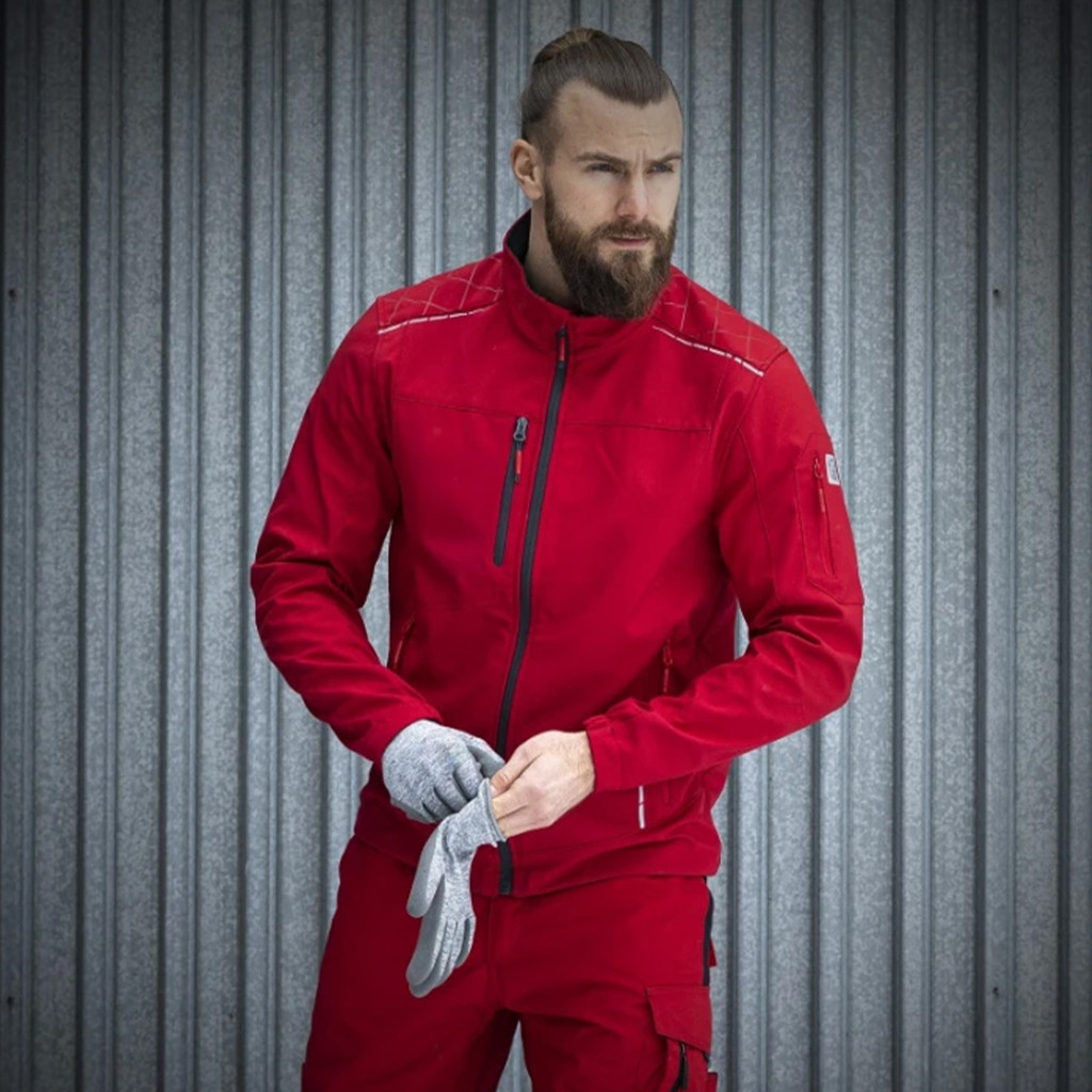 Vízlepergető és szélálló tulajdonságokkal rendelkező, könnyű és lélegző anyagból készült softshell munkaruha kabát.