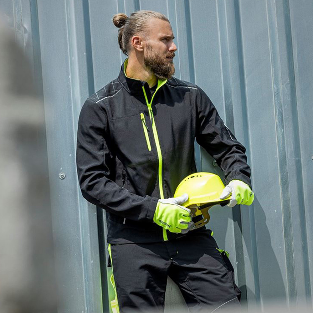 Vízlepergető és szélálló tulajdonságokkal rendelkező, könnyű és lélegző anyagból készült softshell munkaruha kabát.