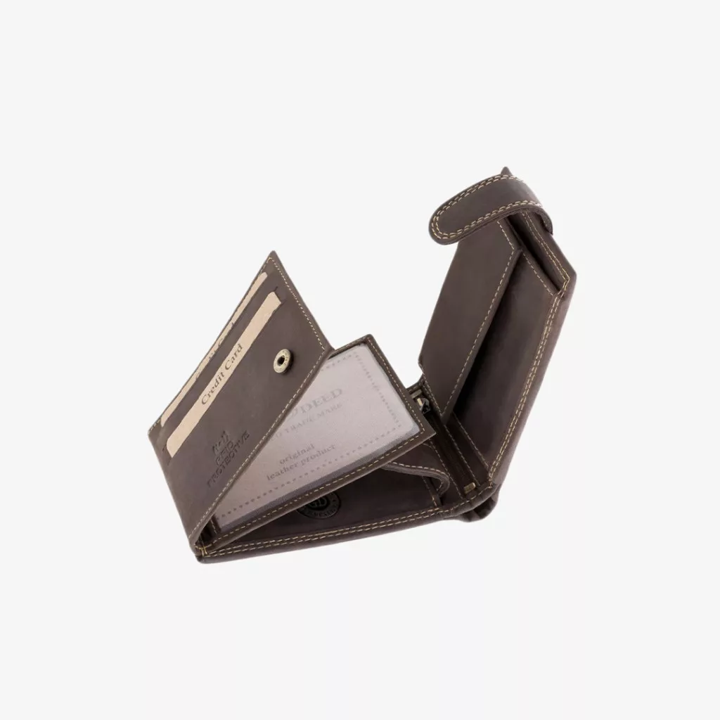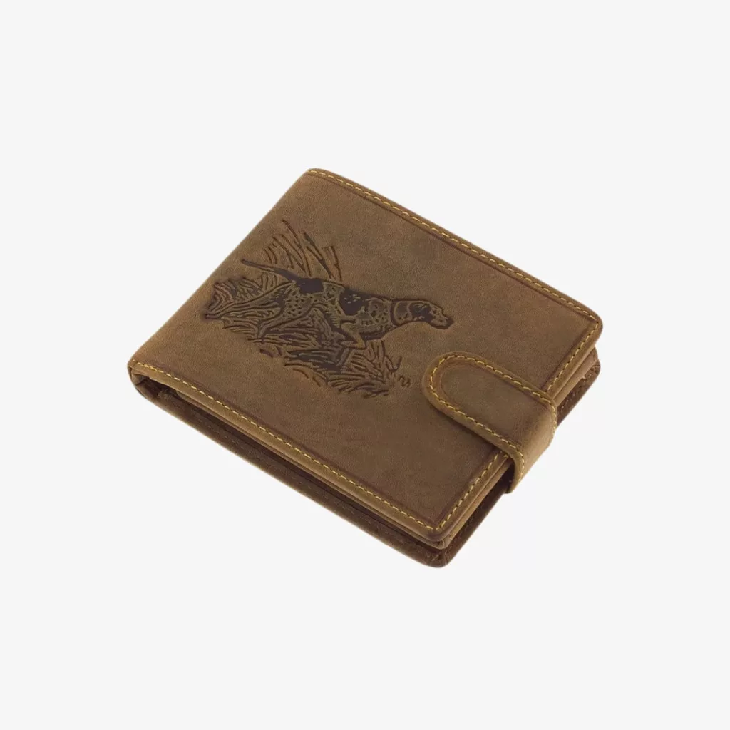 Minőségi bőrből készült, stílusos megjelenésű vadász pénztárca számos praktikus rekesszel, és többféle vadászmotívummal.
