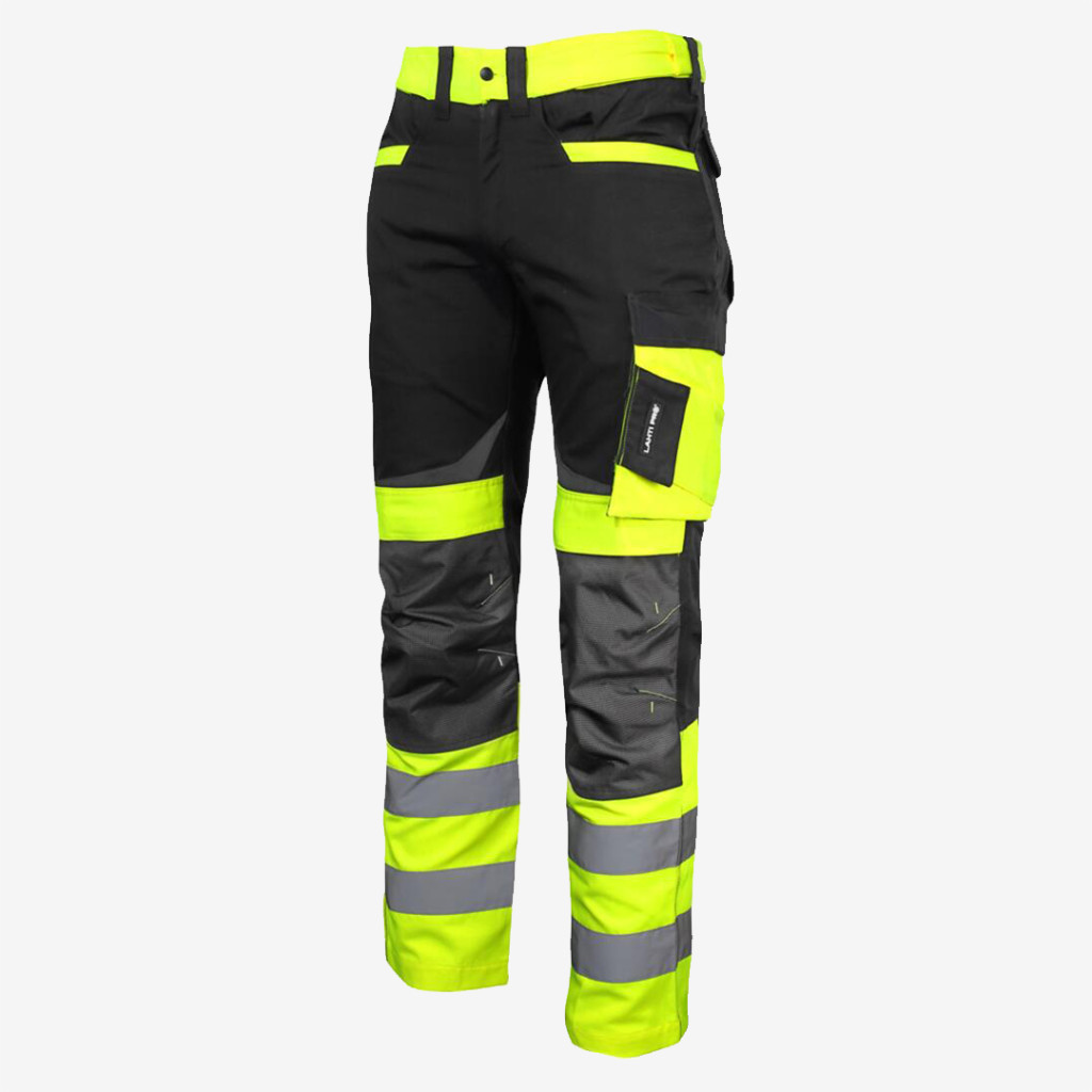 Modern, Slim-Fit szabású, sokzsebes LAHTI PRO láthatósági deréknadrág, megerősített varrásokkal és kopásálló elemekkel.