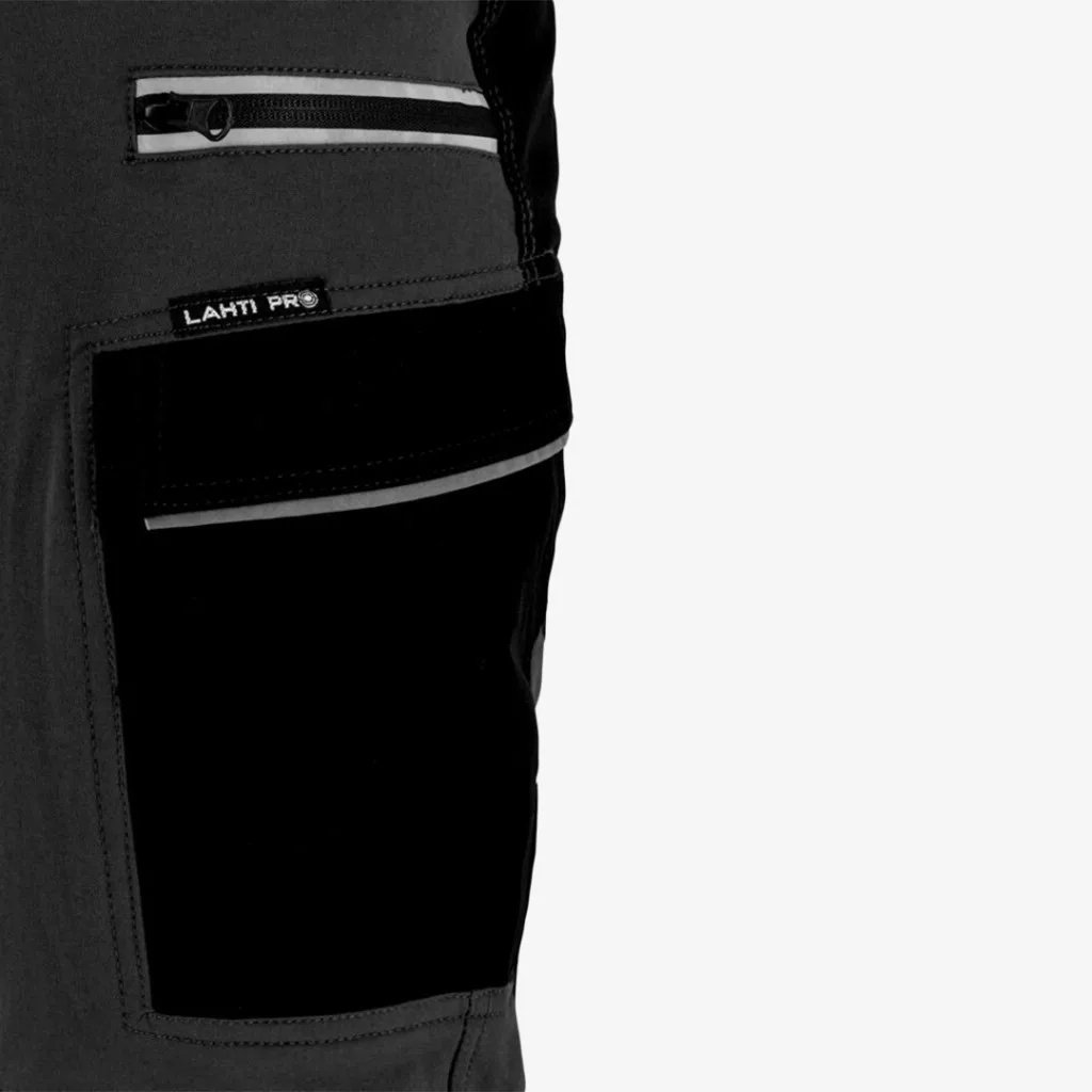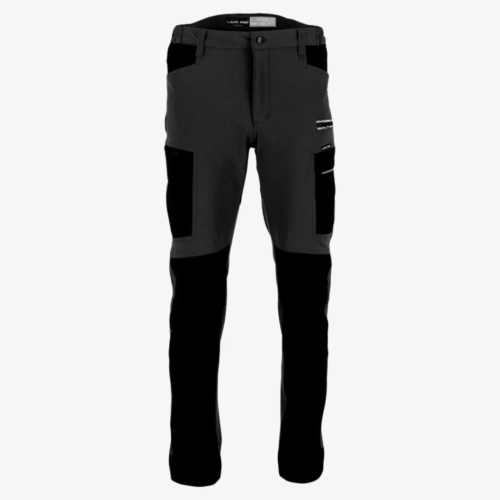 Modern, Slim-Fit szabású, kényelmes és elasztikus anyagból készült LAHTI PRO munkaruha nadrág, erősített varássokkal, sokoldalú tárolózsebekkel, és fényvisszaverő elemekkel.
