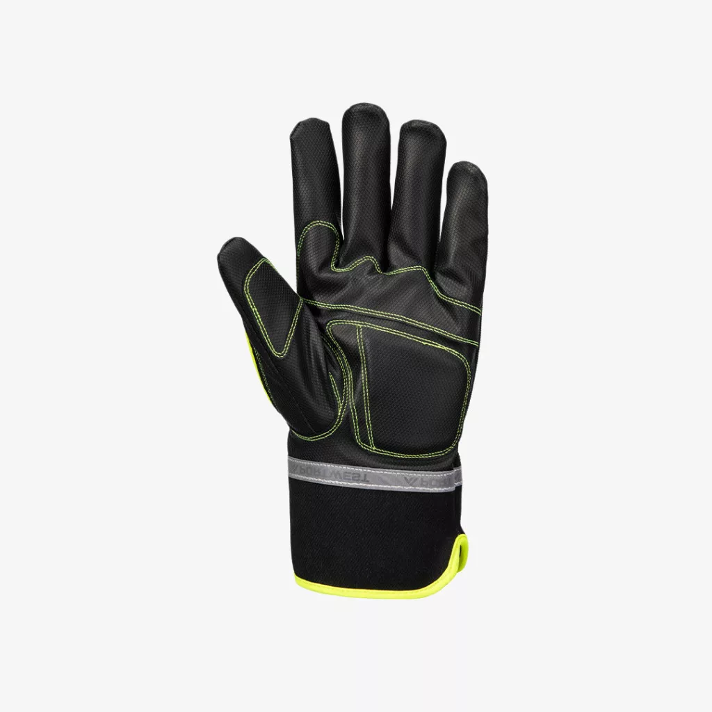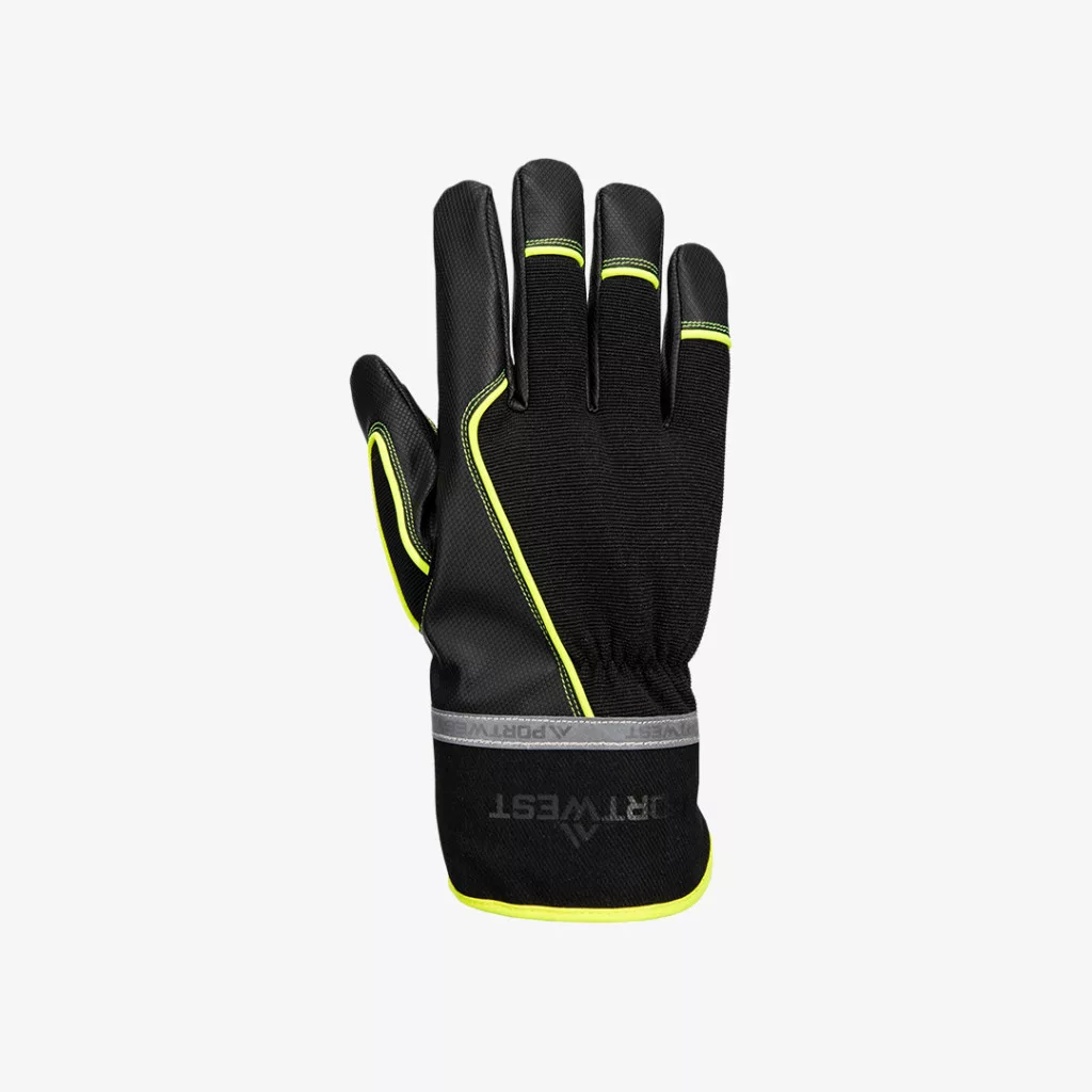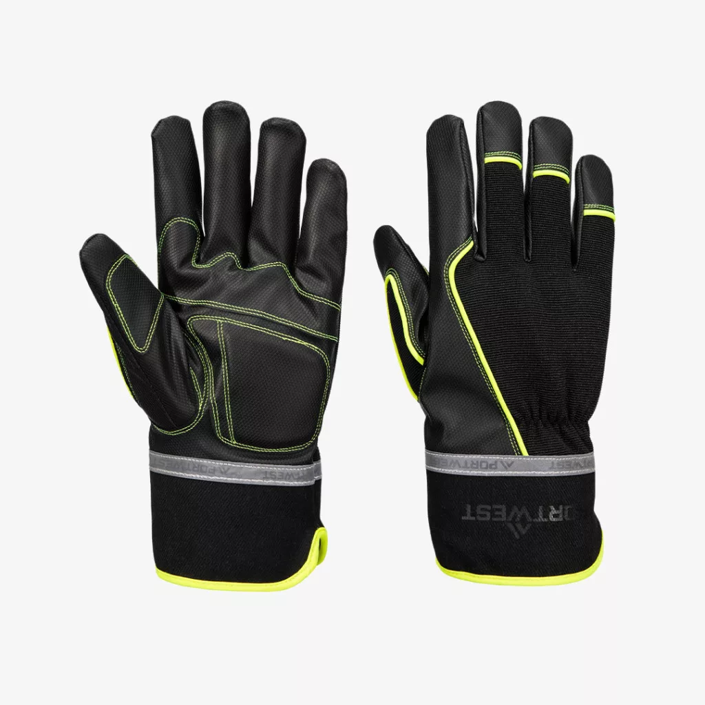 Hideg körülményekre tervezett, vízhatlan belső membránnal rendelkező Portwest szerelőkesztyű, megerősített és textúrált tenyérrészzel, fényvisszaverő felirattal.