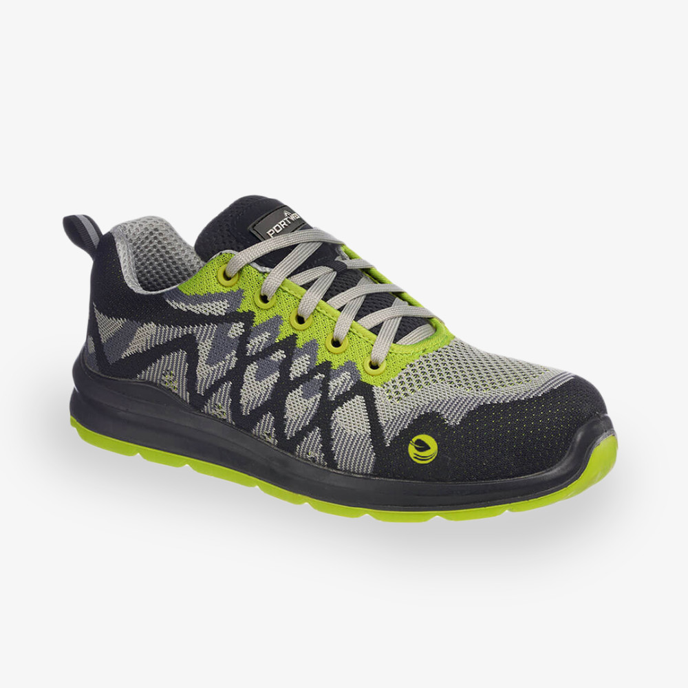 Sportos megjelenésű, környezetbarát, modern kötött anyagból készült felsőrésszel rendelkező, könnyű, lélegző Portwest munkavédelmi cipő, kompozit orr és talpvédelemmel ellátva.