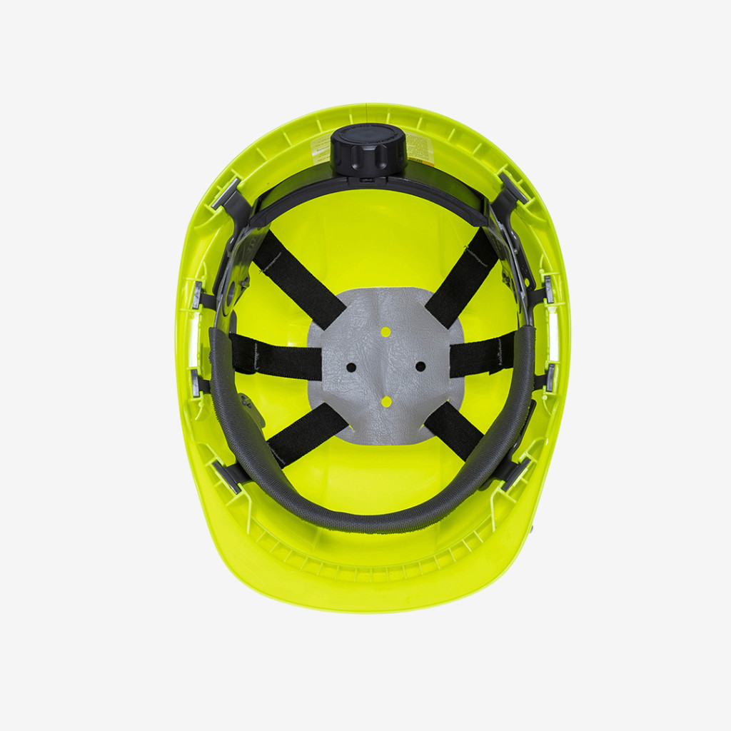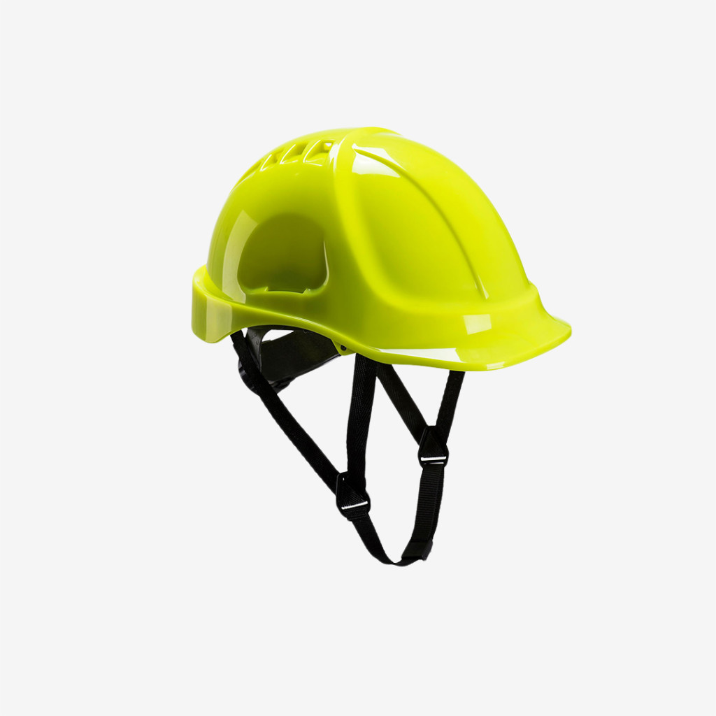 Könnyű súlyú, szellőztetett ABS héjjal ellátott Portwest sisak, pontos textil felfüggesztésű hevederrel, racsnis állítással, Y típusú 4 pontos állszíjjal, többféle szíben.