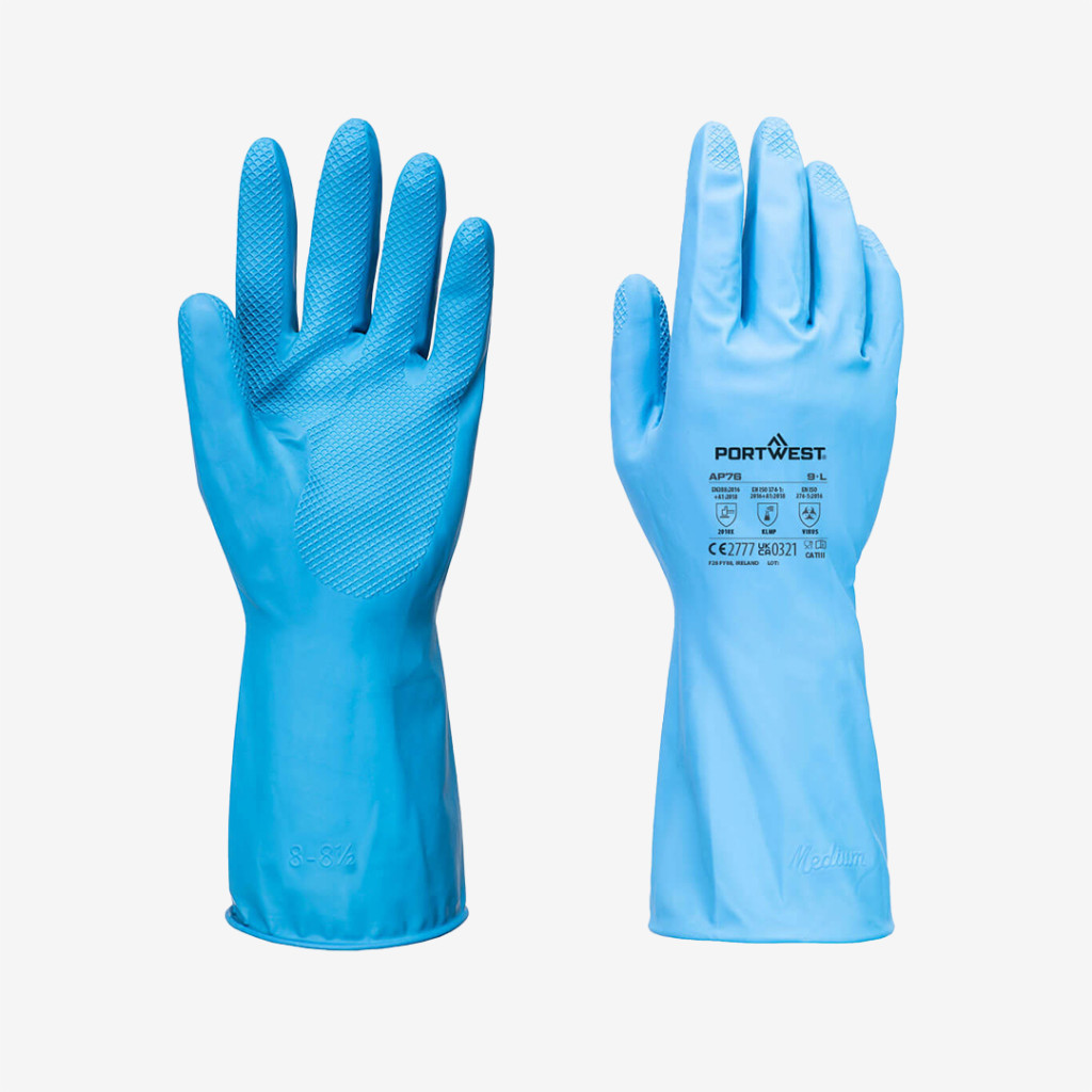 Az élelmiszeripari használatra fejlesztett Portwest vegyszerálló kesztyű, amely ellenáll a zsíroknak, állati zsiradéknak és olajoknak, kiváló minőségű természetes gumiból.