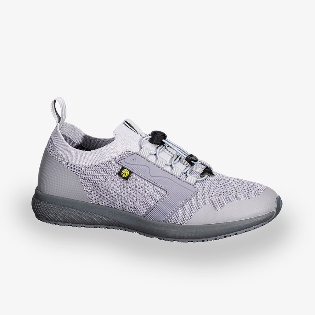 A cipő felsőrésze modern, kötött anyagból készült, amely könnyű, rugalmas és kényelmes illeszkedést biztosít a lábnak. A finoman strukturált, jól szellőző textil kialakítás hozzájárul a komfortos egész napos viselethez, miközben a sportos, letisztult megjelenést is erősíti. A kritikus pontokon elhelyezett megerősített elemek növelik a tartósságot és stabilabb tartást adnak, így a felsőrész nemcsak kényelmes, hanem a munkavégzés során is megbízható. Az állítható gyorsfűzős, gombos megoldás egyszerű és biztos rögzítést tesz lehetővé, a sarok- és nyelvrésznél kialakított húzófülek pedig megkönnyítik a cipő felvételét. Összességében ez a korszerű felsőrész a könnyedséget, a praktikumot és a modern munkacipőkhöz illő funkcionalitást egyesíti.