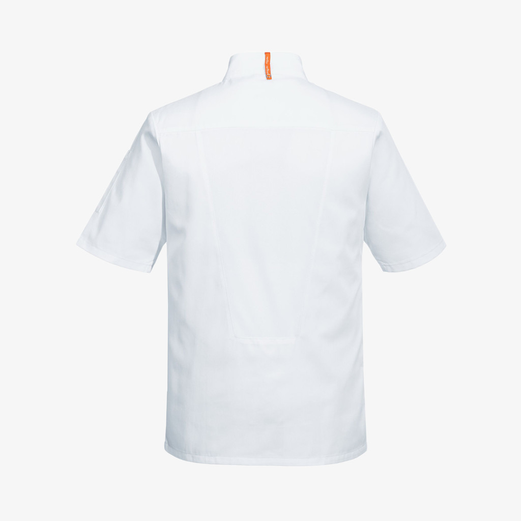 Kiemelkedől szellőzést biztosító MesAir paneles, kevertszálas anyagból készült Portwest rövid ujjú séfkabát. Slim fit szabással a magasfokú komfortérzet érdekében.
