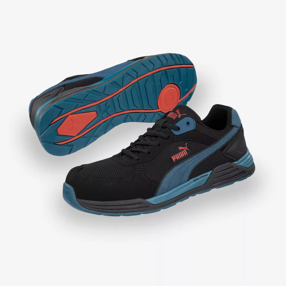 Jól szellőző hálós felső résszel és kényelmes belső kialakítással rendelkező, modern és sportos színössezállítású Puma munkavédelmi cipő.