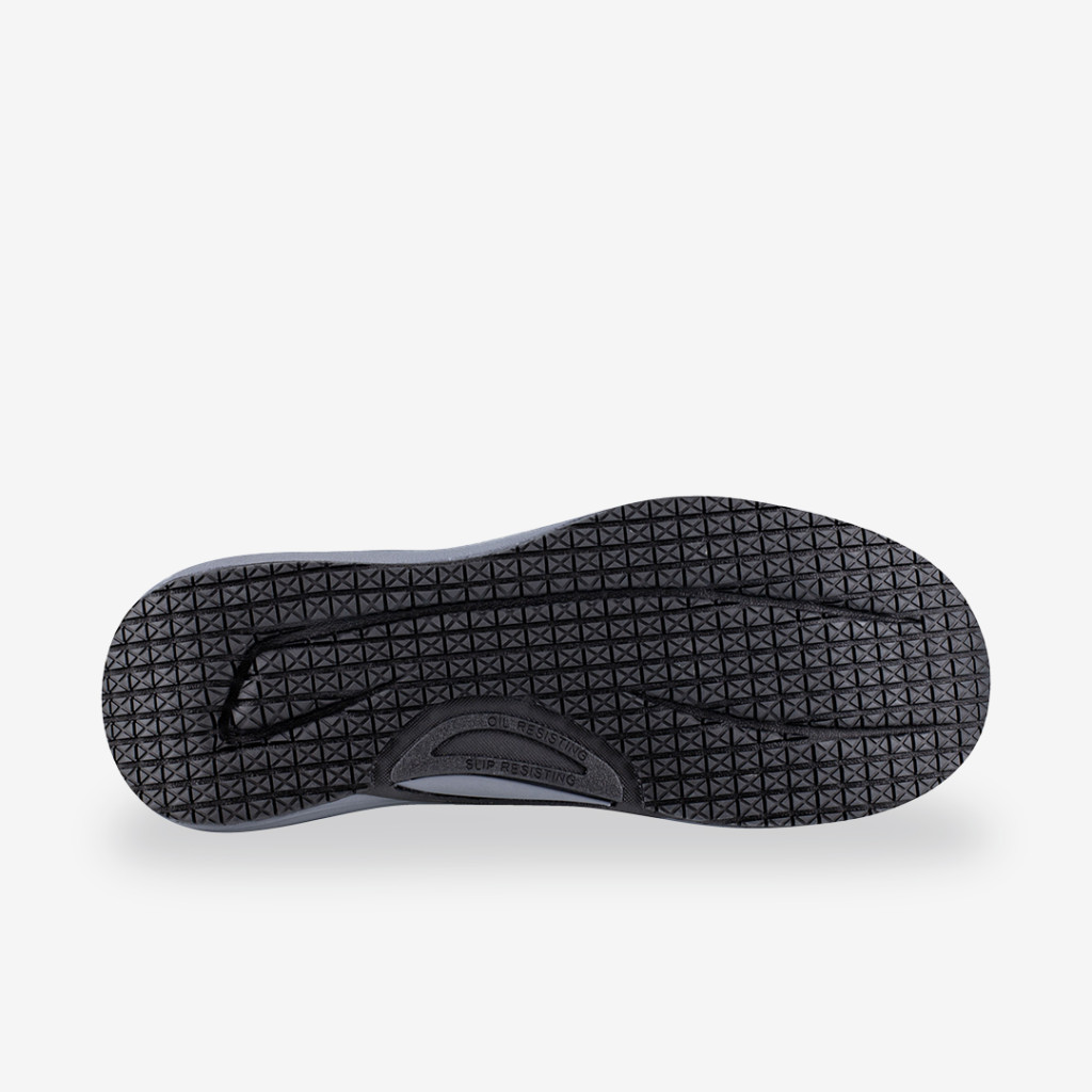 Az oldalpaneleken és a fűzőrendszer környezetében látható szintetikus megerősítések hozzájárulnak a cipő stabilitásához, segítenek megtartani a lábfejet mozgás közben, és növelik a szerkezet tartósságát a kritikus igénybevételi pontokon. A párnázott nyelv és bokarész kényelmesebb illeszkedést biztosít, míg a nedvességelvezető nylon bélés segít szárazabb, komfortosabb belső klímát fenntartani hosszabb viselés során is. Összességében a felsőrész minden eleme azt szolgálja, hogy a cipő könnyű, rugalmas, jól szellőző és mégis kellően ellenálló legyen a napi munkakörnyezetben.