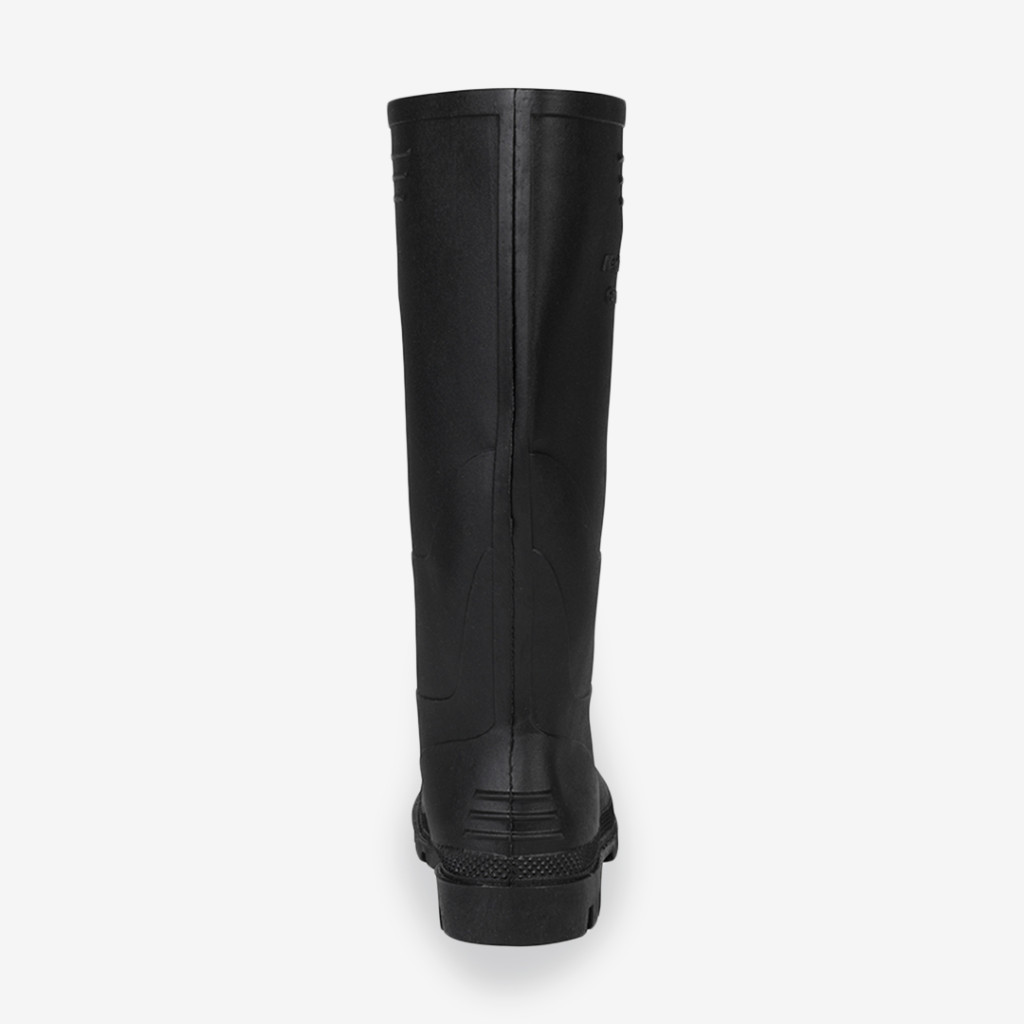 Modern megjelenésű, PVC alapanyagból készült fekete Rock munkavédelmi csizma, mechanikai védelem nélkül, csúszásmentes talppal.
