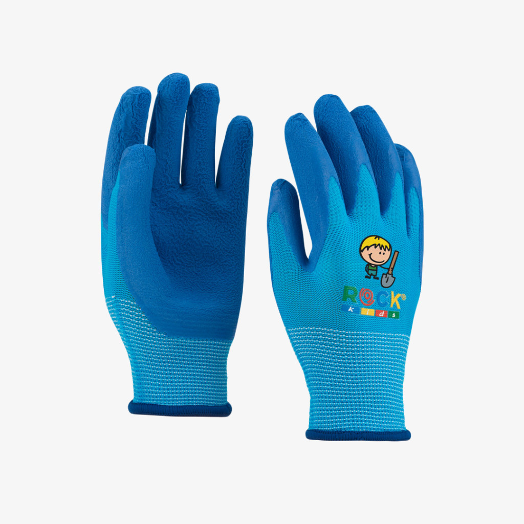 Poliészter alapanyagból, hablatex mártással készülő Rock szerelő kesztyű gyermekek részére, kertész mintával, 4-es méretben.