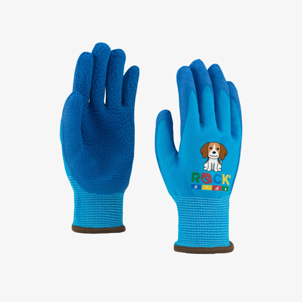 Poliészter alapanyagból, hablatex mártással készülő Rock szerelő kesztyű gyermekek részére, kutyás mintával, 3-as méretben.