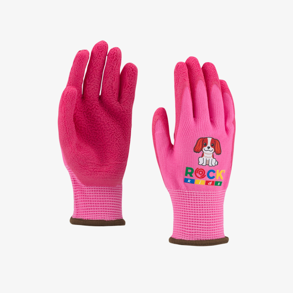 Poliészter alapanyagból, hablatex mártással készülő Rock szerelő kesztyű gyermekek részére, kutyás mintával, 3-as méretben.