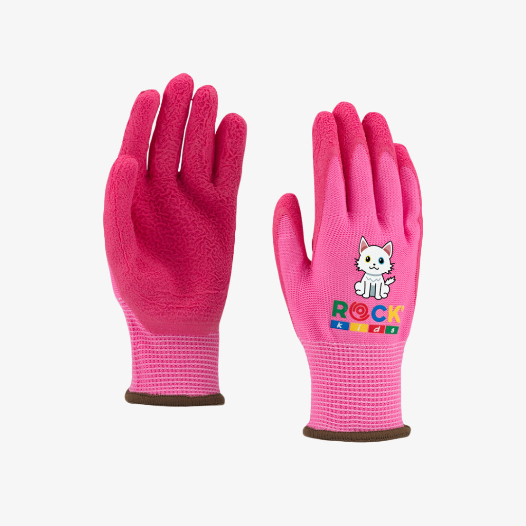Poliészter alapanyagból, hablatex mártással készülő Rock szerelő kesztyű gyermekek részére, macskás mintával, 3-as méretben.