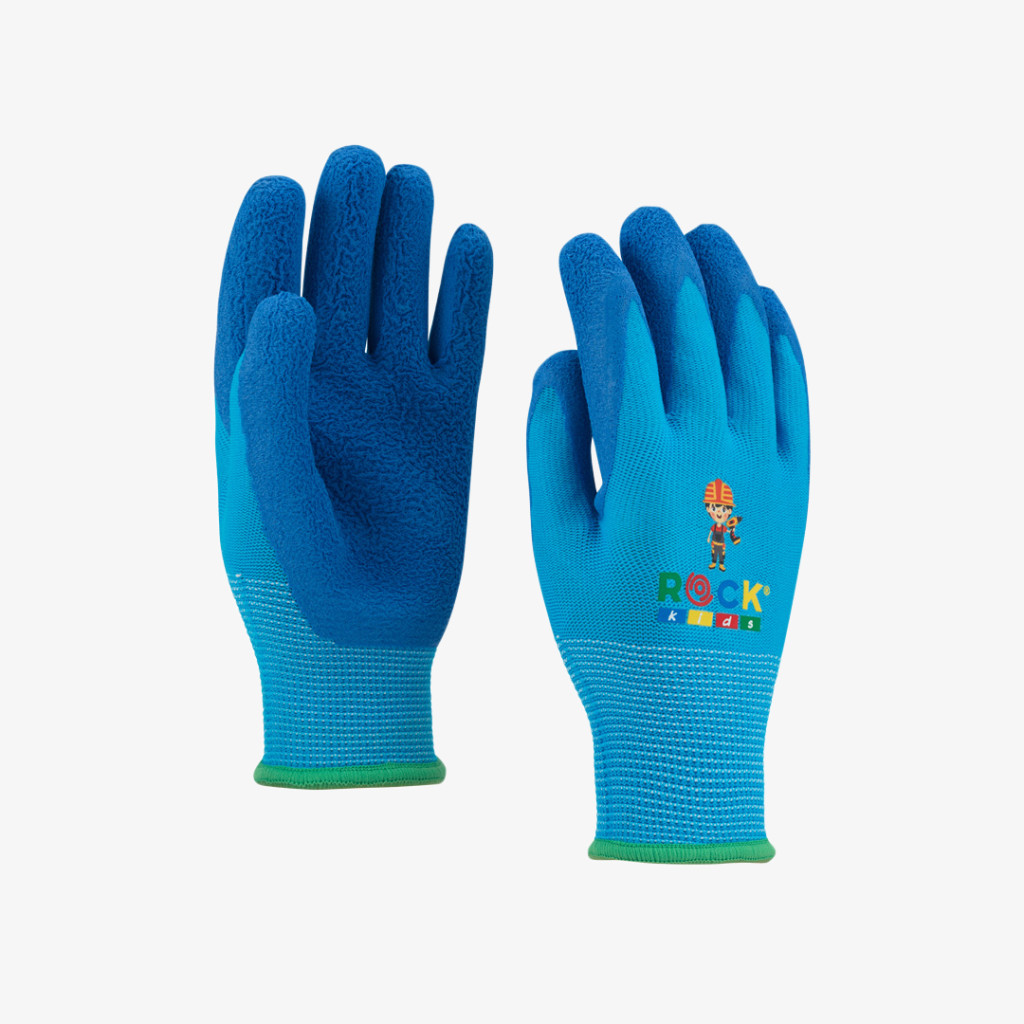Poliészter alapanyagból, hablatex mártással készülő Rock szerelő kesztyű gyermekek részére, munkás mintával, 5-ös méretben.