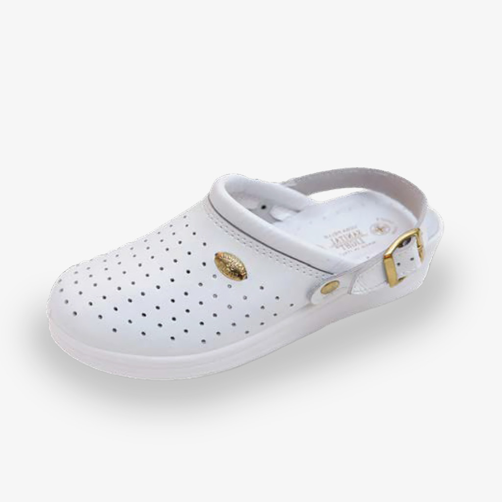 Hátsó pántos kialakítással rendelkező, puha bőr felsőrésszel készülő Sanital Light női klumpa, kiemelkedő kényelmet biztosító anatómiai formázású bőr talpbetéttel és ütéselnyelő talppal. Tökéletes mindennapi viseletnek is.