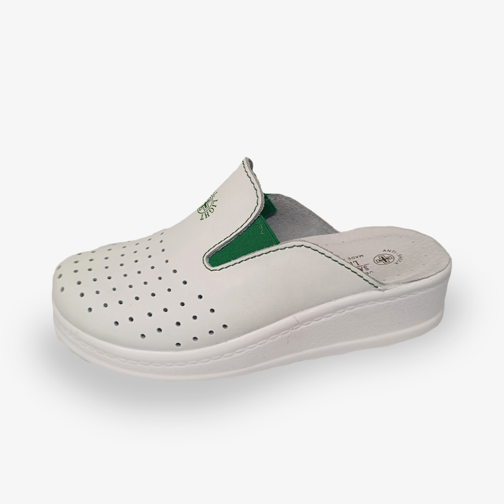 Perforált bőr felsőrésszel készülő Sanital Light női klumpa, kényelmes anatómiai talpbetéttel, és extrakönnyű, csúszásmentes talppal. A rendkívül kényelmes és könnyed kialakításnak köszönhetően hosszú távon is kényelmes viseletet biztosít.