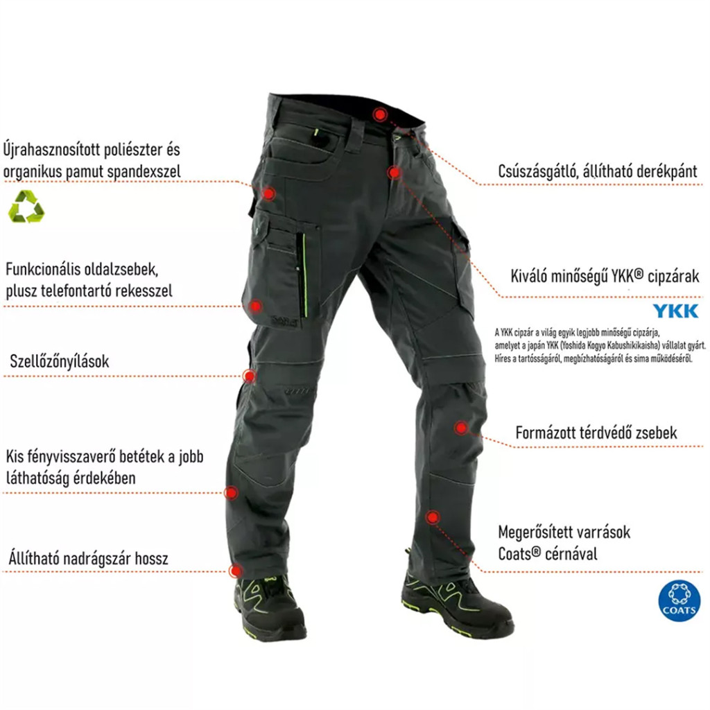 Prémium minőségű Sara munkaruha deréknadrág, mely erős, mégis kényelmes anyagból készült, így a legkeményebb munkakörülmények között is megállja a helyét. Számos praktikus zsebbel rendelkezik, amelyek megkönnyítik a szerszámok és egyéb eszközök tárolását. A Nevada nadrág ideális választás azok számára, akik egy tartós, kényelmes és prémium minőségű munkaruhát keresnek.