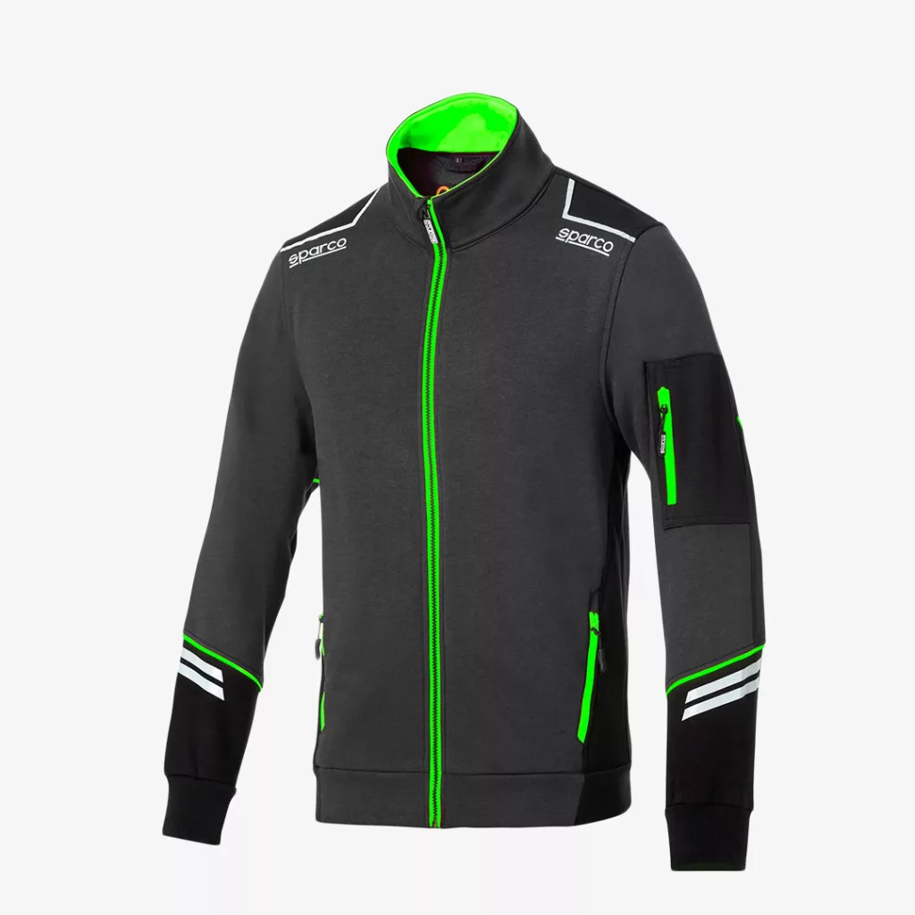 A Sparco Tech Full Zip egy kiváló minőségű cipzáras pulóver, amelyet a kényelem és a funkcionalitás jegyében terveztek. Az erősített ujjak kopásálló betétekkel rendelkeznek, biztosítva a tartósságot és a hosszú élettartamot. A magas láthatóságú fényvisszaverő csíkok növelik a biztonságot gyenge fényviszonyok között.