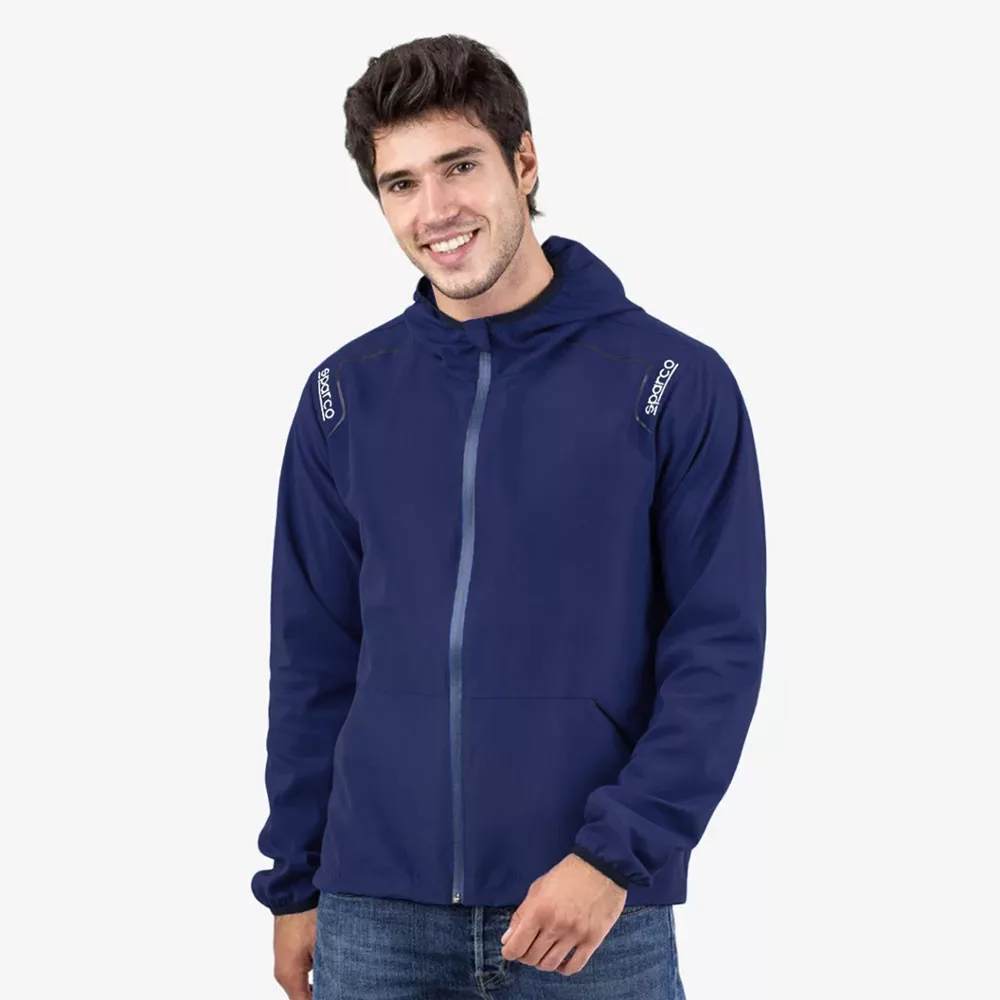 Sportos megjelnést biztosító, kényelmes szabású Sparco széldzseki, könnyű, vízlepergető poliészter alapanyagból. Kapucnis kialakítás, nagy oldalsó zsebek, és bevonatos zipzár teszi tökéletes darabbá akár hétköznapi használatra is.