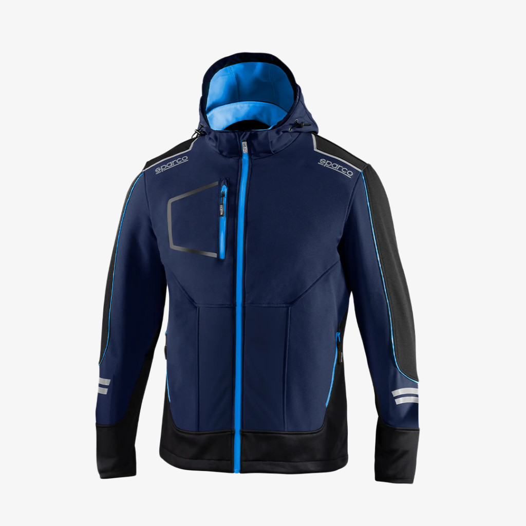 Sportos megjelenést biztosító Sparco munkaruha kabát softshell alapanyagból, megerősített betétekkel a vállaknál és az ujjaknál, praktikus zsebekkel ellátva, és fényvisszaverő elemekkel a jobb láthatóság érdekében.