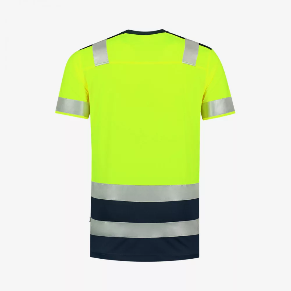 Kényelmes, rövid ujjú jól láthatósági póló fényvisszaverő szalagokkal.