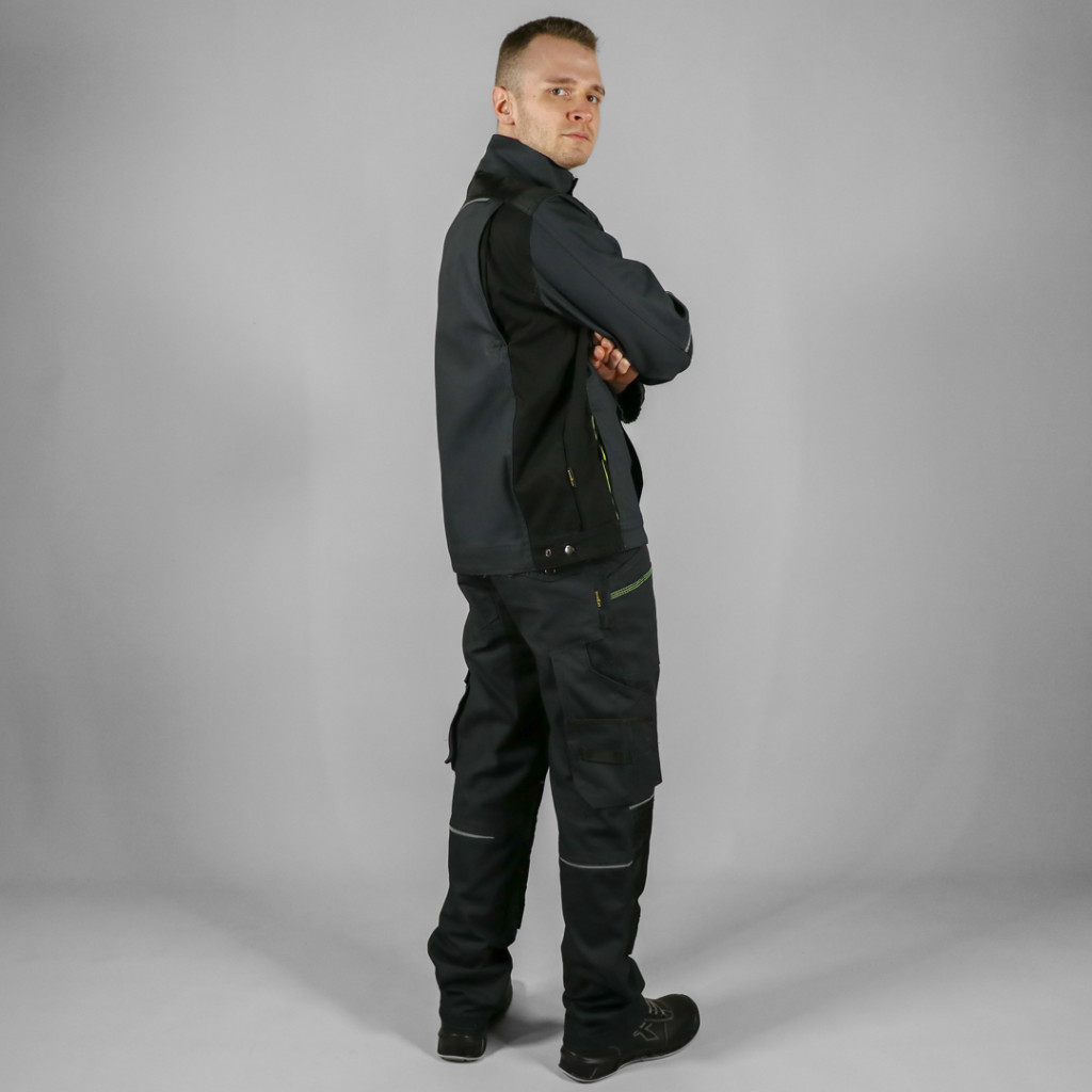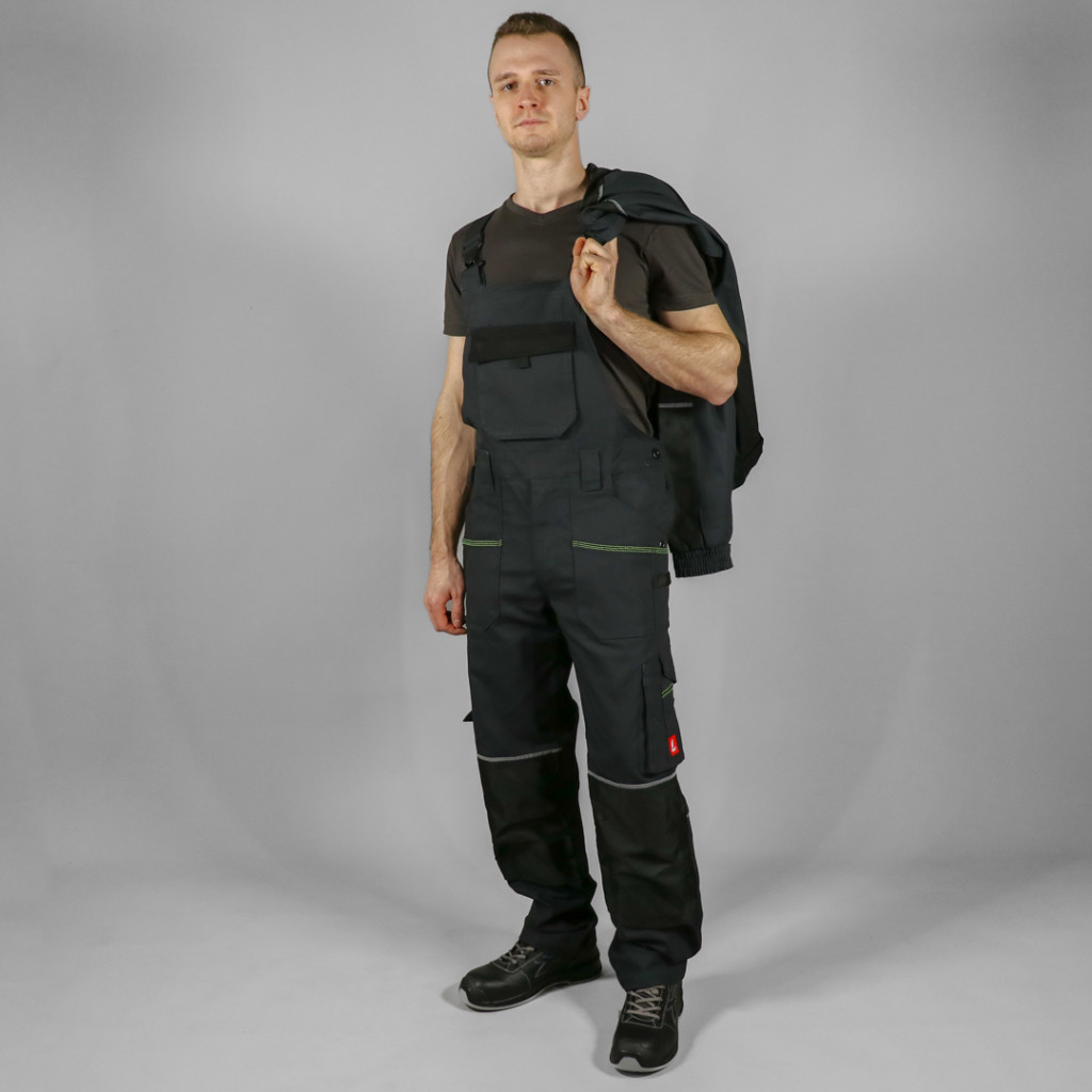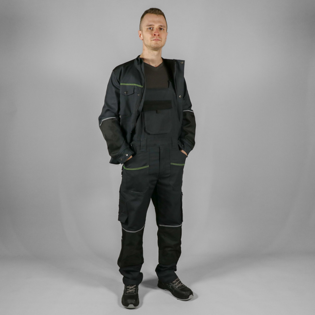 Strapabíró anyagból készült Urgent kertésznadrágból és magas pamuttartalmú anyagból készült Urgent munkáskabátból álló munkaruha szett.