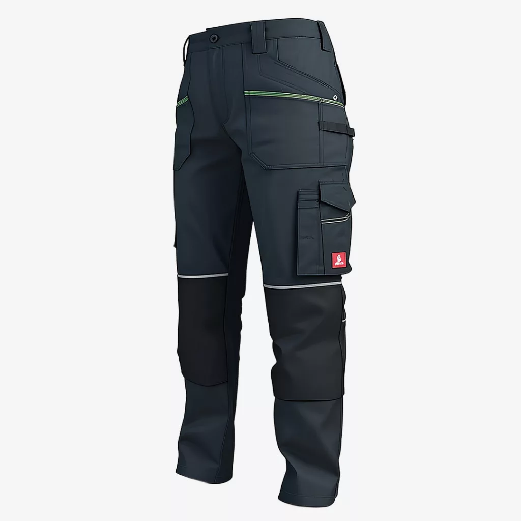 Erős és kopásálló alapanyagból készült munkavédelmi nadrág modern megjelenést nyújtó, kontrasztos színösszeállítással és tripla varrássokkal erősített szabással.
