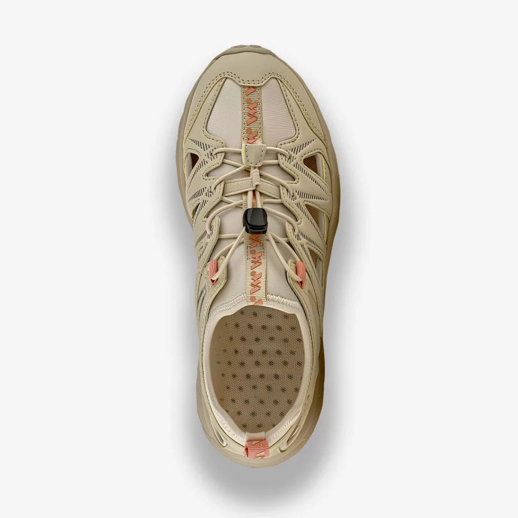 A felsőrész szabásvonala több ponton megerősített, ami nemcsak stabilabb tartást ad a lábnak, hanem ellenállóbbá is teszi a szandált a mindennapos igénybevétellel szemben. A gyorsfűzős megoldás praktikus és jól kezelhető, egyenletes illeszkedést biztosít, miközben a húzóelemmel egyszerűen és gyorsan személyre szabható a szorosság.